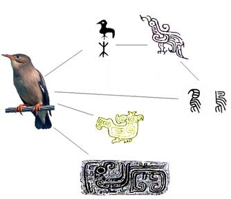 圖片九:圖畫與族徽、文字、青銅紋樣的相互影響關系。族徽、文字、器物紋樣都是自然界事物的抽象化表現(xiàn)之一。而其中族徽的對文字的形成有著特殊的影響。但并不是說族徽是文字產生發(fā)展的必然過程。