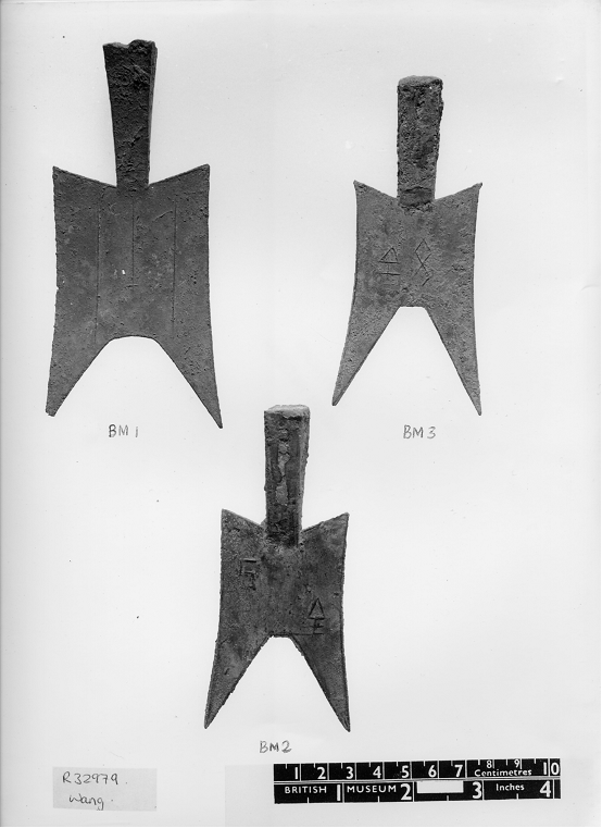 大英博物院錢幣徽章部的中國藏品中有三枚聳肩尖足空首布: