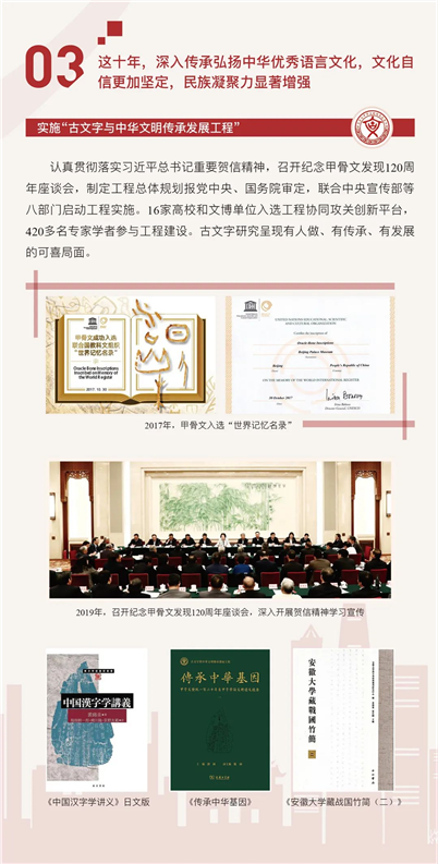 在國家語委發(fā)布的“共譜十年華章 奮楫百年征程——黨的十八大以來語言文字事業(yè)改革發(fā)展成就”的“實(shí)施古文字與中華文明傳承發(fā)展工程”部分,共展示了三項(xiàng)成果,其中有復(fù)旦大學(xué)出土文獻(xiàn)與古文字研究中心的兩項(xiàng)成果。