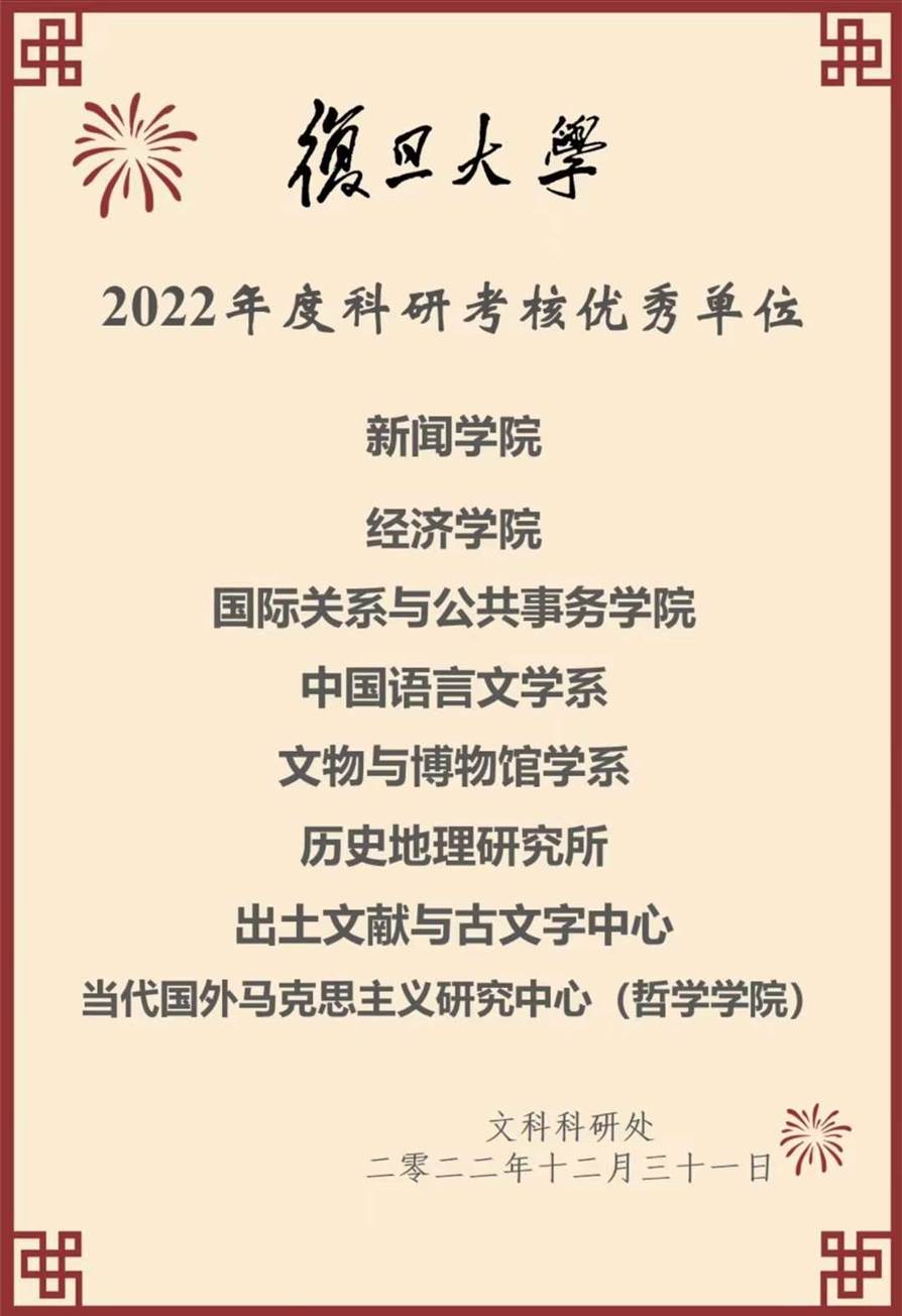 2022年12月31日,復(fù)旦大學(xué)文科科研處公布了“2022年度科研考核優(yōu)秀單位”名單,我中心入選。這是中心連續(xù)第二個(gè)年度入選復(fù)旦大學(xué)科研考核優(yōu)秀單位。