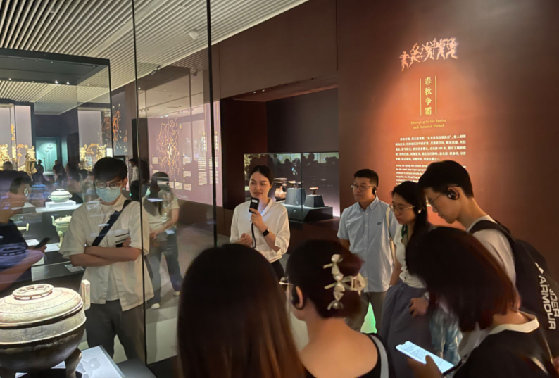 8月28日晚,中心考察團(tuán)同學(xué)乘車到達(dá)武漢。8月29日上午,中心考察團(tuán)同學(xué)們來到湖北省博物館參觀學(xué)習(xí),湖北省博物館張曉云館長接待了同學(xué)們。同學(xué)們首先參觀學(xué)習(xí)了“曾侯乙”“越王勾踐劍”“曾世家”“楚國八百年”展廳,并聆聽了“曾侯乙編鐘音樂會”,感受中國古代樂器的魅力。