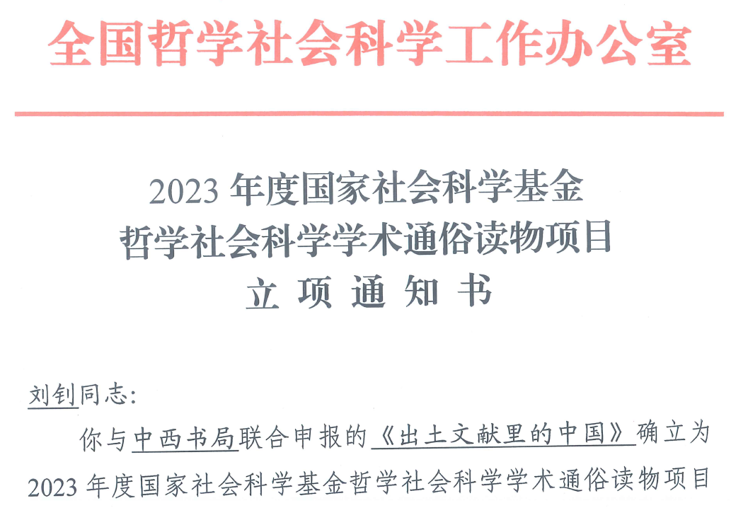 2023年12月12日,中心與中西書局聯(lián)合申報(bào)的《出土文獻(xiàn)里的中國》獲首批國家社科基金哲學(xué)社會(huì)科學(xué)學(xué)術(shù)通俗讀物項(xiàng)目立項(xiàng)。