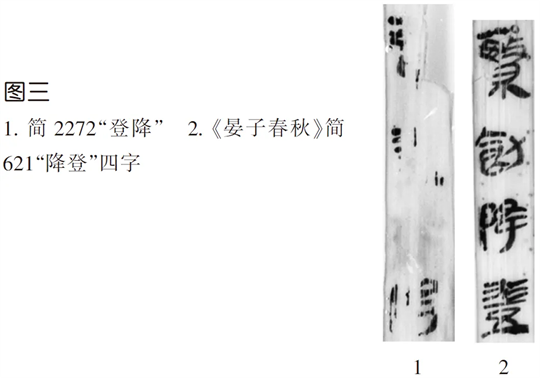 登降”三字,與《晏子春秋》相關(guān)簡文對比(圖三),即可將其遙綴入《晏子》第十五章,並釋讀得更加準(zhǔn)確:“今(簡619)孔丘盛爲(wèi)容