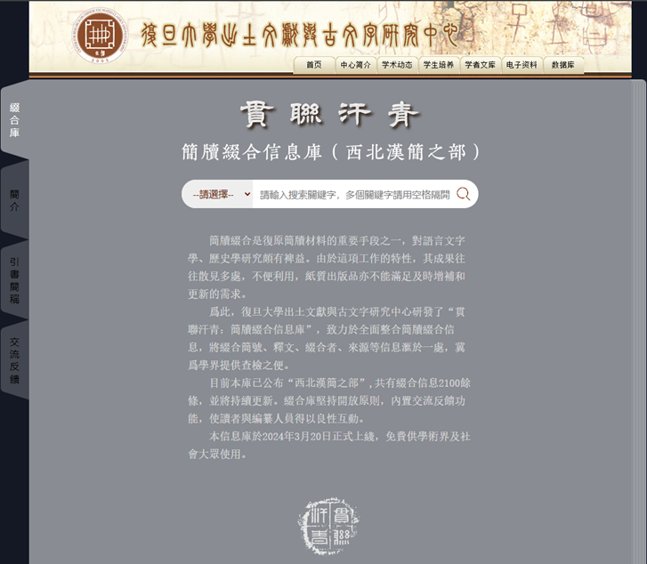 爲(wèi)全面總結(jié)簡牘綴合成果、進(jìn)一步推動(dòng)簡牘材料整合和學(xué)科發(fā)展,在復(fù)旦大學(xué)出土文獻(xiàn)與古文字研究中心的規(guī)劃和支持下,“貫聯(lián)汗青:簡牘綴合信息庫(西北漢簡之部)”(網(wǎng)址:http://itcscarpellini.com/GuanLianHanQing/Home)依托復(fù)旦大學(xué)出土文獻(xiàn)與古文字研究中心網(wǎng)站正式發(fā)布。