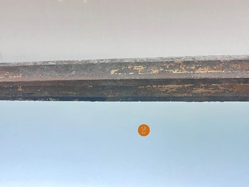 “必視之身中有黑兩桁不絕者”,陳力主張“兩桁不絕”是指稱為“黑”的鍛層相互平行、各無斷絕,并舉出建初鐵刀高低碳層相間的現(xiàn)象為證據(jù)。[18]其實這是一種誤解,高低碳層是在刀劍反復(fù)折疊鍛打的過程中形成的,因此分層的現(xiàn)象也只能在斷面中觀察,這一點以往的研究已說得很清楚。[19]而相劍者一般是無法看到刀劍的斷面的,除非刀劍已經(jīng)破損或折斷漏出截面,因此“黑兩桁”很顯然不能以此立論?!毒友訚h簡相劍刀冊釋讀析疑》又提出這句話意為“劍身中有黑堅,與白堅相間,兩偶并行,各不斷絕”,但這樣的現(xiàn)象不論在鋼鐵劍還是青銅劍中似乎都未曾看到。兩文的共同點是,都把“黑”當(dāng)作名詞,將“兩桁”理解為平行、并行之類的意思,從而均在“黑”后點斷。按我們的意見,這樣句讀是錯誤的,因為“黑”形容的正是“兩桁”的顏色。