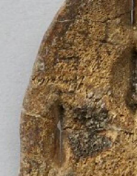 正面13辭曰:“乎《摹系》7433反面2辭曰“取日?伐”,《新研》乙6273反面D辭釋作“取合伐”。根據(jù)清晰照片,《新研》D辭釋文更為合理。該辭位于右首甲二排第1個卜兆處,與正面兆序“一”對應(yīng)。因為拓片模糊不清,故單看拓片容易將所施之鑿尖狀的前端訛混作刻寫的筆畫。照片中“取合伐”三字涂墨,“合”字跨右首甲與右前甲夾角[10]齒紋,且與右前甲夾角一排第1個鉆鑿存在打破關(guān)系,形體依稀可辨,參考圖一。“合”在卜辭中有會合、聚合義[11]。“合”可以用在不同祭名之間,如《屯南》248有辭曰“貞:又(侑)