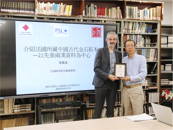 2024年10月17日20:00—22:00,法國高等研究實(shí)踐學(xué)院風(fēng)儀誠(Olivier Venture)教授來中心作了題爲(wèi)“介紹法國所藏中國古代金石拓本——以先秦兩漢資料爲(wèi)中心”的講座。此次講座是中心二十周年慶系列活動之“好古敏求”青年講壇第二場。講座由中心蔣玉斌研究員主持,中心主任劉釗教授、張傳官研究員、蔣文副研究員、任攀青年副研究員、阿列霞(Olesia Volkova)青年副研究員,復(fù)旦大學(xué)歷史學(xué)系林志鵬教授,上海博物館葛亮副研究館員,以及中心十?dāng)?shù)位師生共同參加。