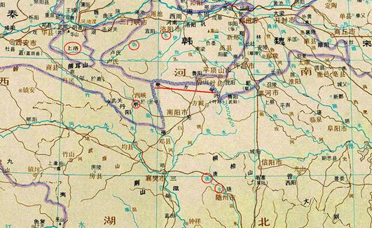 其次,三國交界的邊境,發(fā)生有關(guān)三方的衝突是可能的。據(jù)李守奎先生所引清華簡《系年》,吳人入郢後,秦國出兵相救,“與吳人戰(zhàn)于析”,“析”即今河南西峽縣附近,位於秦國境內(nèi);追擊楚王的吳人能長驅(qū)直入進入秦境作戰(zhàn),可見此三角地帶的交通還是比較便利;另外楚方城北段也臨近伊洛流域,說明伊洛之戎與楚境內(nèi)的“秦(溠)戎”有發(fā)生衝突以及楚“救秦戎”完全有地理空間上的可能性。