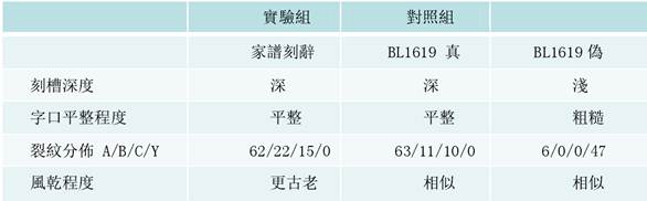 最後我們將《庫(kù)》1506家譜刻辭與《庫(kù)》1619骨版的真?zhèn)慰剔o就刻槽深度、字口平整程度、刻劃與裂紋的物理關(guān)係分析、及兩片骨版的風(fēng)乾程度所作比較的結(jié)果列在表三。