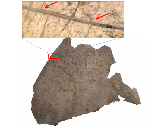 艾蘭首先觀察到扇形牛肩胛骨乾燥之後產(chǎn)生的裂紋其走向與刻劃之間的特殊物理關(guān)係,並利用這種關(guān)係論證家譜刻辭為真。為了求證其實(shí)驗(yàn)的真確性,筆者決定重複顯其微鏡觀察實(shí)驗(yàn)。[15]實(shí)驗(yàn)設(shè)計(jì)除以《庫(kù)》1506版為實(shí)驗(yàn)組利用立體顯微鏡對(duì)其進(jìn)行觀察照相外,並選取《庫(kù)》1619(即《英藏》2512或《合集》41724)作為實(shí)驗(yàn)對(duì)照組。《庫(kù)》1619左方的兩行刻辭為真刻,辭云:『癸卯王卜貞旬亡