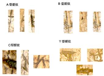 (3)裂紋走向:我們首先以顯微鏡比較觀察《庫(kù)》1619版上真刻與偽刻的物理差異,特別注意扇形骨版上細(xì)微裂紋的走向與刻劃的關(guān)係。艾蘭提出在扇形肩胛骨刻辭為真時(shí),後起的裂紋常會(huì)沿刻辭豎筆成一致走向而穿過槽底。裂紋與刻辭豎筆走向一致,我們稱之為A型紋,如果刻槽比較乾淨(jìng),還可以清楚看見裂紋穿過槽底,我們把可以見之於槽底的裂紋稱之為B型紋。我們觀察《庫(kù)》1619此片左方真刻可見細(xì)微裂紋與刻劃走向一致,這個(gè)現(xiàn)象在右方偽刻幾乎看不到(圖1316A)。這樣的區(qū)別在放大的顯微鏡下更為明顯(圖16B)。我們?cè)僖哉婵讨械摹凹馈弊譃閷?shí)例(圖16C),顯微鏡下不但可以看見裂紋與豎筆刻劃走向一致(A型紋),也可以明顯看見刻劃槽底有裂紋穿過(B型紋)。圖16的結(jié)果證明艾蘭以A同B型裂紋作為判斷真?zhèn)蔚奈锢頊?zhǔn)則經(jīng)得起驗(yàn)證。另外除了A與B型裂紋外,有時(shí)可以看見刻劃槽底裂紋也會(huì)隨著彎曲的刻劃而轉(zhuǎn)彎,或者因?yàn)榭虅潛趼范詾閺澢D(zhuǎn)向。這種裂紋我們稱之為C型裂紋。(見圖16C右)除此三種裂紋外,我們注意到在《庫(kù)》1619版右方的偽刻,往往因?yàn)榱鸭y的存在在先,偽刻在後,一些靠近裂紋的刻劃有向裂紋處延伸或擴(kuò)張的爆裂現(xiàn)象,這樣會(huì)影響刻劃的裂紋我們稱之Y型紋。(見圖13右邊)。為方便識(shí)別起見,我們這四種裂紋的典型例子並列於圖17。仔細(xì)考察這四種裂紋在《庫(kù)》1619左右兩組真?zhèn)慰剔o中的分佈,可得到如表一所列數(shù)據(jù)。由表一可見A,B,C這三型裂紋幾乎完全不見於右方的偽刻之中。而Y型紋則完全不見於左方真刻之中。