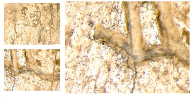 表一的結(jié)果顯示了以全版刻辭的裂紋分佈可以提供一個(gè)幾乎是涇渭分明的區(qū)分商代肩胛骨刻辭真?zhèn)蔚臏?zhǔn)則。利用同樣方法我們仔細(xì)以顯微鏡觀察《庫(kù)》1506家譜刻辭上54個(gè)刻字與骨版裂紋的關(guān)係。圖18是兒氏家譜刻辭中可見的A型裂紋,圖19是典型的B型裂紋,圖20是典型的C型裂紋。我們計(jì)算各型裂紋在54個(gè)刻字的分佈發(fā)現(xiàn)兒氏家譜刻辭中只見A,B,C三型裂紋而完全不見Y型裂紋,更有意思的是A,B,C三型裂紋在家譜刻辭的分佈比例與《庫(kù)》1619左方刻辭幾乎完全一樣(表二)。