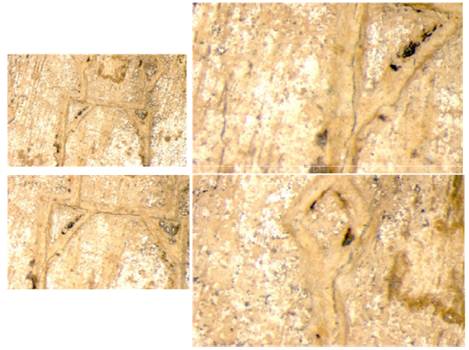 另外筆者在立體顯微鏡下仔細(xì)觀察扇形肩胛骨的裂痕或裂紋,發(fā)現(xiàn)這些裂紋並非呈黑色,因之也無(wú)所謂墨漬問題。(見圖18-20)至於學(xué)者認(rèn)為一些清末出土的殷墟甲骨因?yàn)榈叵滤贿€高,濕度適於骨質(zhì)保存,所以因?yàn)轱L(fēng)乾所產(chǎn)生的裂紋可以在~1904年偽刻之後產(chǎn)生。以是不能以刻劃先,裂紋後作為真刻的必然證據(jù)。這個(gè)提法至少在家譜刻辭這片骨版是不適用的。理由如下:(1)家譜刻辭的骨版如果出土?xí)r骨質(zhì)猶存尚未風(fēng)乾,為何成半殘缺?(2)比較觀察《庫(kù)》1506及《庫(kù)》1619兩片骨版的背面,可以很明顯的看出《庫(kù)》1506骨版的風(fēng)乾程度遠(yuǎn)超過《庫(kù)》1619骨版(圖21),表示家譜刻辭骨版出土?xí)r,不可能骨質(zhì)猶存。所以其上裂紋也不可能為近百年的產(chǎn)物。