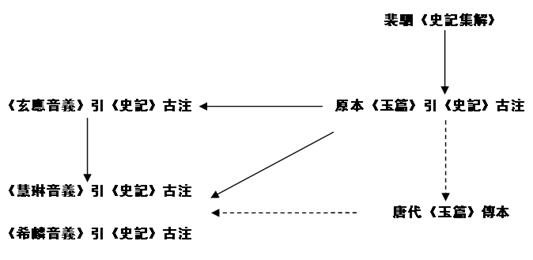 僅從玄應、慧琳《音義》承襲《玉篇》引文的諸多特徵現(xiàn)象來看,《音義》中所引的《史記》古注並非直接援用裴駰《史記集解》。從時代上看,玄應《音義》與顧野王《玉篇》時代非常接近,其中的《史記》古注極有可能直接節(jié)引自原本《玉篇》,慧琳、希麟《音義》中《史記》古注材料的來源可能有三:原本《玉篇》傳本,唐代《玉篇》傳本、玄應《音義》,而《玉篇》中《史記》古注的來源正是裴駰的《史記集解》。這幾者之間的關係圖解如下: