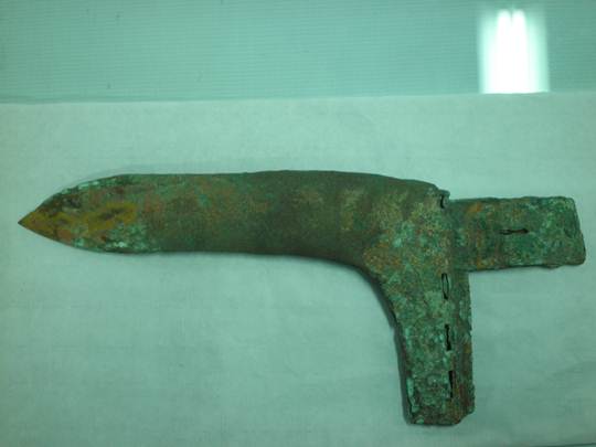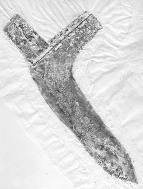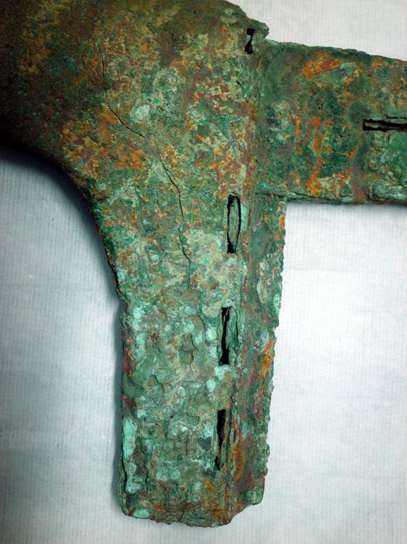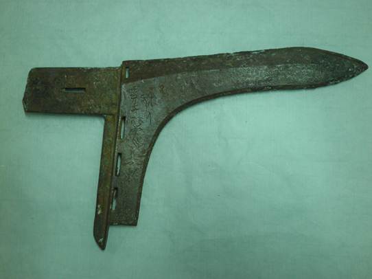 2008年,安徽省文物考古研究所先后在安徽蚌埠地區(qū)發(fā)掘了兩座奇特的春秋時(shí)期墓葬,出土了一批有銘青銅器,銘文資料已公布在發(fā)掘報(bào)告中。值得注意的是,一號(hào)墓中還出土兩件徐國(guó)兵器:M1:47戈和M1:382戟。由于其材料的獨(dú)特性,一直未正式公開發(fā)表。 M1:382戟長(zhǎng)29厘米,鑄有銘文:“余(徐)王容(?)?。考鹱宰髌湓?/SPAN>□” (胡部,銘文銹蝕嚴(yán)重,隸定以意補(bǔ)之);M1:47戈長(zhǎng)20厘米,兩面均有銘文:一為“余(徐)子白(伯)