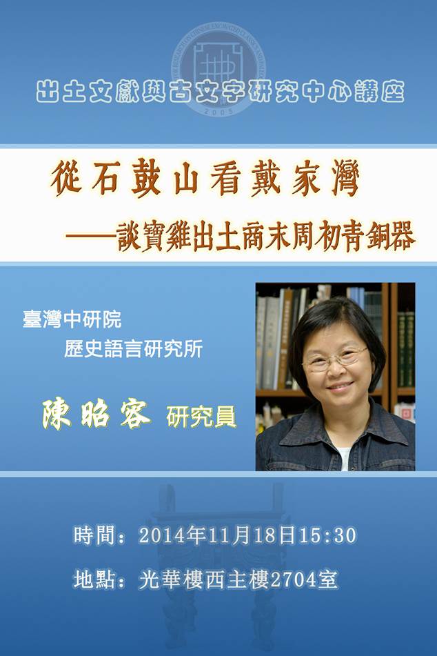 臺灣中研院歷史語言研究所陳昭容研究員將於2014年11月18日下午在我中心作題為“從石鼓山看戴家灣——談寶雞出土商末周初青銅器”的學術講座。