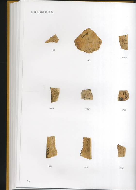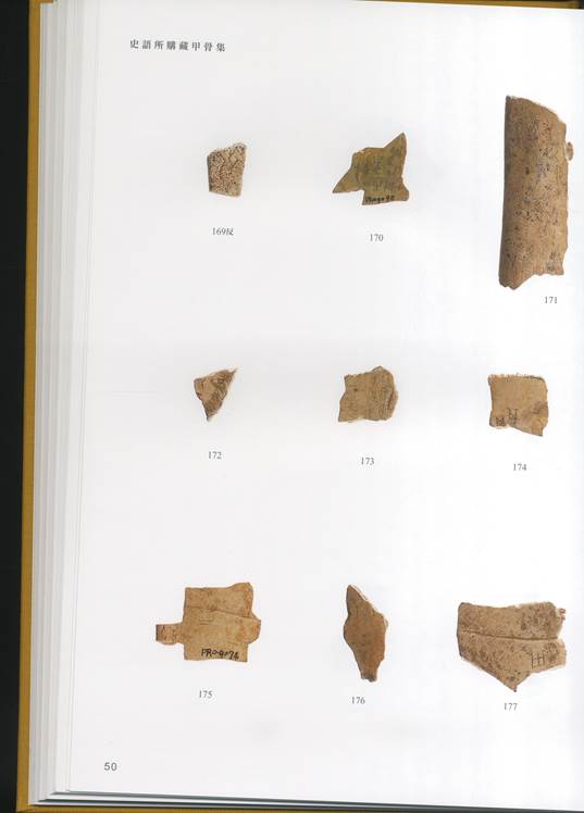 《史購》是近年來出版的,照片製作較為精良的甲骨著錄書。其中照片部分若是骨條上半明半暗光線處理得再柔和些會更理想,例如:《史購》13。該書的調(diào)色,也是近年來做的比較好的,以骨色為主。問題是同一個頁面的甲骨顏色稍趨同,48頁偏黃,50頁偏紅,58頁偏淺,62頁偏深等。