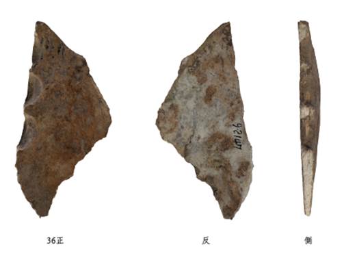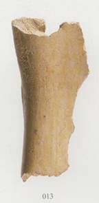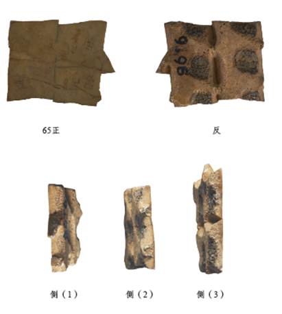 其四、圖版放置角度錯誤。照片倒置,如:《旅》65側(cè)(3),314側(cè),433側(cè),1131側(cè),1156反,1184,1401反,1536側(cè),1642側(cè),1792正反,1850側(cè)等。拓本倒置,如:《旅》1967、2025等。照片橫置,如:《旅》1289,1658等。斜置,這種問題是最多的?!堵谩?SPAN>65(3)在第一版電子稿中如下圖,最後一張側(cè)面照片的拍攝,意在展示甲骨鑽鑿橫切面的形狀與深度。校稿時標(biāo)示應(yīng)該順時針旋轉(zhuǎn)90度,把它放平,出版時被“倒置”。甲骨側(cè)面照片倒置的情況比較多,究其原因是編纂者對其認(rèn)知不夠明確造成的。