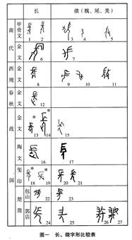 第1~4辭中的微,舊釋為長。微與長混淆由來已久,余曾加以區(qū)別。商周文字中微與長,都像人披長發(fā)形,其區(qū)別在于微字無手杖,而長字有手杖?!拔ⅰ笔穷^發(fā)之發(fā)的本字,音同借為微小、微妙的微或美,和國族的魏。而“長”像人拄杖形,會意,是杖的本字?!墩f文》:“棖,杖也?!币敉铻殚L幼和長短的長。戰(zhàn)國古璽中的長字,是在人腿上加圓點或彎鉤以為指事字,意為長肢在此。楚簡中用頭發(fā)飄動的方向,區(qū)別長和微,頭發(fā)飄向右的是長,飄向左的是微(圖一)[1]。