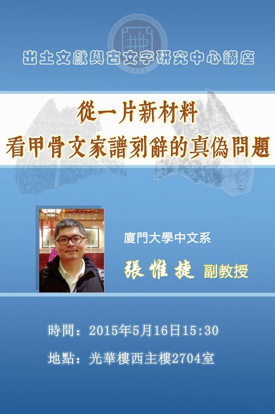 廈門大學中文系張惟捷副教授將於2015年5月16日15:30在光華樓西主樓2704室作題爲“從一片新材料看甲骨文家譜刻辭的真?zhèn)螁栴}”的學術講座。