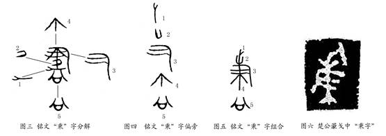 ,從聿,者聲?!惫怒t文[11]和古陶文[12]“書”字均從聿,者聲。與本銘字形不合,釋“書”誤。此字上半部分筆畫怪異,無(wú)法隸定。但如果把上半部分筆畫分解以后(圖三、圖四),重新組裝,可以組成秉字(圖五)。組成的秉字與楚國(guó)兵器楚公