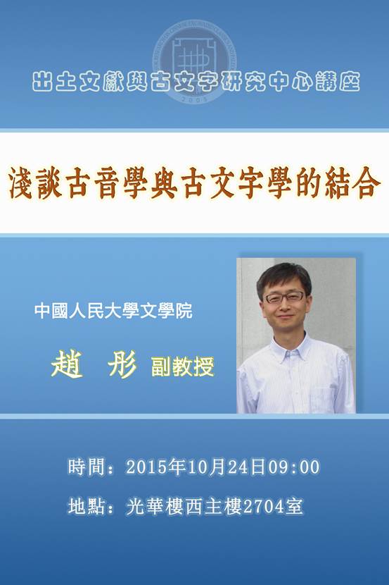 中國人民大學文學院趙彤副教授將於2015年10月24日09:00在光華樓西主樓2704室作題爲“淺談古音學與古文字學的結(jié)合”的學術講座。