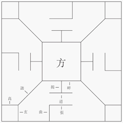 哈佛大學(xué)的曾藍(lán)瑩先生曾通過(guò)對(duì)尹灣漢墓出土《博局占》的研究,確定了《西京雜記》許博昌條“方畔揭道張究屈玄高”九個(gè)棋位在博局上具體位置(圖八)。