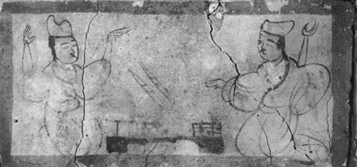 甘肅嘉峪關(guān)六博畫(huà)像磚為彩繪壁畫(huà),與陶俑和畫(huà)像石相比,因其制作材料與創(chuàng)作工藝之便,對(duì)現(xiàn)實(shí)的反應(yīng)更具準(zhǔn)確性。嘉峪關(guān)六博畫(huà)像磚與大英六博俑所描繪的游戲場(chǎng)景與人物手勢(shì)幾乎相同,均為兩人相對(duì)博具(博局、籌枰)而坐,一人雙手上舉,另一人左手上舉、右手前伸。
