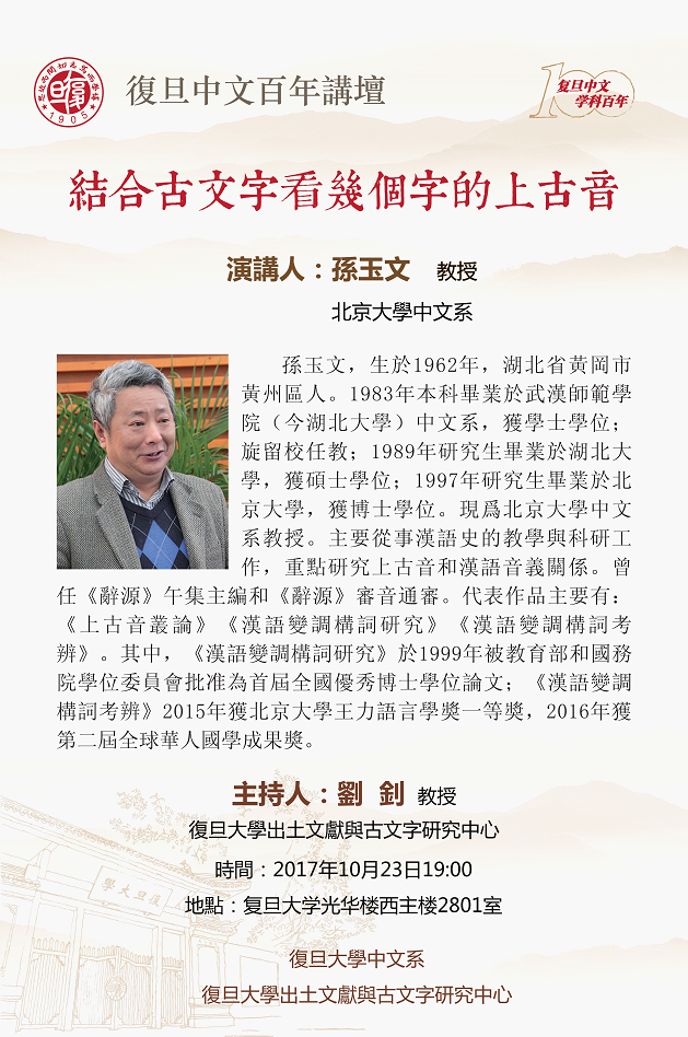 北京大學(xué)中文系孫玉文教授將於2017年10月23日19:00在光華樓西主樓2801室作題爲(wèi)“結(jié)合古文字看幾個字的上古音”的學(xué)術(shù)講座。