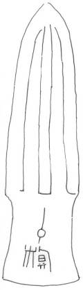 該矛形體較細(xì)長(zhǎng),葉最寬處在基部。矛中脊隆起,周邊有刃向內(nèi)斜凸,邊刃與中脊凹下形成兩道血槽。銎孔為橢圓形。骹長(zhǎng)約占總長(zhǎng)的三分之一強(qiáng),基部略寬,有一圓穿。骹基部中間有一字銘文。