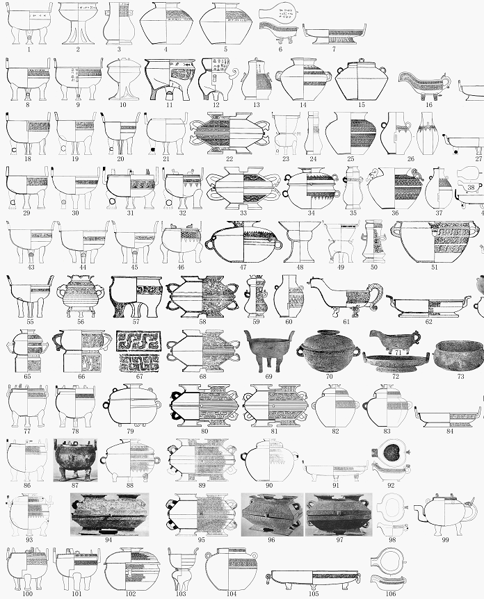 1-7.光山寶相寺1983MG1A1、A3、A5、A7、A8、A10、A9  8-17.光山寶相寺1983MG2(A1A2、A8A4、A6A14、A10、A3A13、A12)  18-28.洛陽(yáng)西工區(qū)2005M883651、46、5461、4447+53、59、43、42、62、41 29-42. 洛陽(yáng)西工區(qū)2005M88323、1、5、11、18、13、2、7、15、1225、17、3926  43-54.海陽(yáng)嘴子前1994M471、72、94、9078、80、87、9173、133、95132  55-64.滕州薛故城1978M16267、7076、52、6357、56、167  65-68.商水朱集1975M(噩仲簋、蟠螭紋簋·紋飾、原仲簠)  69-76.洛陽(yáng)中州路1954M241547、8、9、5、7、89  77-85.襄陽(yáng)沈崗2009M10221、27、3、4、5、6、8、9  86-92.淅川下寺1979M76、7、8、9、32、1  93-99.淅川下寺1979M88、14、3、2、5、6  100—106.南陽(yáng)李八廟2004M11、2、5、34、6、7