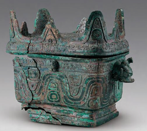 蓋平面為圓角長方形,頂面和四邊壁面微隆,頂面外緣一周矗立八個山峰形提手,四角提手較高,中間較低,蓋子口內(nèi)折,舌較短,內(nèi)斂較甚。器身敞口,卷沿上翹,方唇,斜直腹,平底略圜,下接圈足,足外撇且下折成階,足底面斜平內(nèi)折,內(nèi)側(cè)有折溝,口、腹、圈足橫截面均為圓角長方形。上腹左右兩側(cè)置龍首形。蓋頂面淺浮雕四隻大鳥紋,兩隻一組,每組二鳥相對。鳥昂首前視,圓目凸出,長冠前部下垂向後卷折, 冠羽分二股,內(nèi)側(cè)一股冠羽末端向後卷折至尾部,短身,身下一足,長尾分二股,後曳而回卷,尾下有雲(yún)形分尾。鳥頸飾陰線羽紋,身飾陰線雲(yún)紋。頂面中部飾一菱形紋。以陽線雲(yún)雷紋為地。蓋四壁淺浮雕八隻鳥紋,每面兩鳥鳥首相對,以簡化獸面紋為界。鳥圓目凸出,冠羽分兩股,前股粗壯而長,前伸而下折回卷,後股較細而短,後曳而上卷,短身,身下兩足,分尾,向後平伸而上折回卷。以陽線雲(yún)雷紋為地。蓋頂四角山峰形捉手外面主紋為翎 眼紋,地紋為陽線雲(yún)雷紋,山形上部和提手間隨山峰走勢飾以雙陰線紋。山形捉手內(nèi)面飾蟬形陰線雲(yún)紋,其上也以雙陰線相連。器身上腹部飾八隻鳥紋,每面兩隻,與蓋壁面鳥紋略同,正、背面二鳥間以高浮雕獸頭,獸頭凸圓目,目中部有凹坑,彎眉上翹,高鼻樑,鼓腮,平吻,橫“C”形寬大雙角,額飾菱形紋,腮飾斜陰線紋。器身兩側(cè)二鳥間以龍首形,雙空腔,龍首圓目凸出,目中部有凹窩,頭上立圓柱狀雙角,角首略粗,寬額,棱角分明,面凹曲,鼻樑塌陷,吻部凸出,口兩側(cè)露尖齒,面飾陰線雲(yún)紋,額中部飾陰線菱形紋,耳面飾陰線紋,角前面飾心形雲(yún)紋,角後面飾蟬形雲(yún)紋,角首面飾陰線渦紋。器身中、下腹飾寬波帶紋,以三周陰線將寬波帶分為寬窄不等的四重波帶,波峰間飾雙陰線勾勒的心形和口形紋,以陽線雲(yún)雷紋為地。圈足上飾兩周凸弦紋。蓋和器身合範分鑄,蓋四壁中部獸面紋及其上部山形捉手中部各有一條豎向範線。器身拐角各有一條豎向範線。耳腔內(nèi)、圈足內(nèi)拐角處存有少量範土。底面有“X”形雙陽線加強筋,對角分佈。圈足內(nèi)壁與外底面轉(zhuǎn)折處有六個三角形支撐,正、背面各二個,兩側(cè)中部各一個,對稱分佈。蓋四壁面、山峰形捉手和外底面均有縮孔。器身底部有墊片,不甚明顯。龍首耳腔內(nèi)與器身結(jié)合部有方形墊片。整器打磨較好,紋飾經(jīng)打磨。[1]
