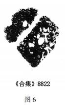 《合集》8822與《合集》5924這兩片甲骨上的“取”字刻寫極其形似,且分別為左首甲和右首甲的,它們很可能是斷自同一版龜甲的對(duì)貞卜辭。然而,由于《合集》8822的拓本質(zhì)量較差,形態(tài)信息不全(見圖6),所以這也只能是推測(cè)。直到我們?cè)趪?guó)圖網(wǎng)站看到“北圖10741”的拓本,經(jīng)比對(duì)可以確定,它正是《合集》8822的新拓。北圖10741拓本信息完整,可與《合集》5924綴合。經(jīng)國(guó)圖工作人員胡輝平女士以實(shí)物驗(yàn)證,這組綴合可以成立。如果沒有“北圖10741”的清晰拓本,那《合集》8822與《合集》5924的綴合恐怕只能是懸案。《合集》中有相當(dāng)一部分來于自國(guó)圖的甲骨殘片,著錄情況與《合集》8822相似,相信隨著國(guó)圖甲骨新拓的出版,會(huì)有相當(dāng)一部分甲骨可以“破鏡重圓”。
