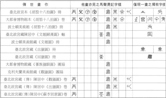 近年中央美術學院博士研究生彭慧萍女士一直從事“馬臀燙印與番馬畫鑒定”的研究,連續(xù)寫出了四篇系列論文。在《馬臀燙印與番馬畫鑒定——以臺北故宮本〈胡笳十八拍圖〉冊為例的斷代研究》一文中,歸納了傳世畫作馬的形象中描繪出的馬的燙印字樣,并列成了如下的一覽表: