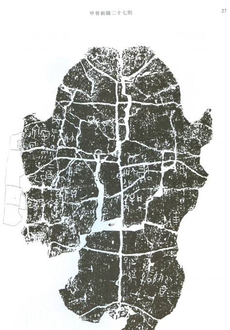 ”這個(gè)字形的釋法是遊移不定的?!缎⊥湍系丶坠恰め屛摹?A title="" href="#_edn17" name=_ednref17>[17]將第(8)片背甲考釋為: