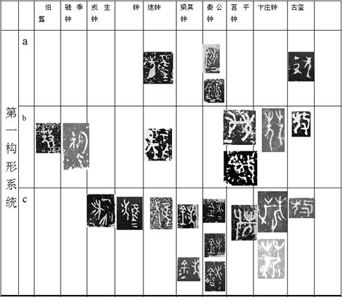 卞莊鐘銘文“敖”字的出土,讓我們看清D式形符實(shí)際上是從攴而非從戈。將卞莊鐘銘文“敖”字的三個(gè)字形置入筆者《釋“鷔鷔雝雝”》一文的“第一構(gòu)形系統(tǒng)”中,則其“敖(10-2)”字形遠(yuǎn)承伯簋“敖”形,又下啟古璽“敖”形;其“敖(9-2) ”、“敖(11-7-1)”兩形與莒平鐘銘文均有所訛變,因此,卞莊鐘銘文“敖”字三型,是“ 敖”字發(fā)展演進(jìn)過程中的一個(gè)關(guān)鍵字形。