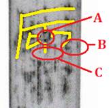A:此處中空,豎筆不連貫 B:右旁多出的橫筆無(wú)法解釋 C:不見(jiàn)“大”的雙腳“人”形 |