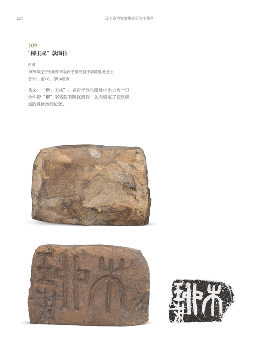 館藏考古出土及傳世的封泥、磚瓦、陶器器銘也是富有地方特色與歷史價值的。如凌源縣安杖子出土了十?dāng)?shù)枚封泥,朝陽縣十二臺鄉(xiāng)袁臺子出土了百余件帶有“柳”“城”“柳城”字樣的板瓦和筒瓦片[17],朝陽及遼東地區(qū)出土的陶銘及墓磚等,具有一定的時代特點,這些有銘器物與現(xiàn)已發(fā)現(xiàn)的數(shù)十座漢代城址及其遺物一起,是秦漢時期開發(fā)東北的歷史見證。