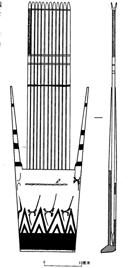 應(yīng)釋為「笮」,《儀禮‧既夕禮》鄭玄注:「笮,矢箙?!勾梭锌蓪?duì)應(yīng)《包山楚墓》南室出土的一件「竹箙」,內(nèi)裝有二十支箭,與簡文所記相合。竹箙由箙座,前後壁板,左、右擋板構(gòu)成。箙座及前、後壁板是木質(zhì),左、右擋板是竹質(zhì)。後壁板比前壁板長,從《包山》的線圖看,它們的比例約為四比一,[14]>>如圖一。[15]>>《楚文物圖典》介紹了四件矢箙,其中一件是1954年湖南長沙市左家公山第四中學(xué)校內(nèi)15號(hào)墓出土的箭與木矢箙,其圖形如圖二[16]>>。荊門左冢楚墓也有矢箙出土,「由箙座、後壁板及左右擋版組成。……前壁板短,後壁板長」,[17]>>如圖三。此外馬王堆三號(hào)漢墓出土一件木質(zhì)矢箙(圖四),雖是明器,[18]>>但形制可以參考: