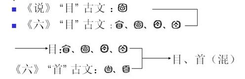 ”等形。我們從《六書通》里收集的古文“首”字和“目”字比較能看出它們極其相似,傳抄或使用時比較容易混淆,“目”很容易訛變成“首”字。從上面我們已經(jīng)知道“