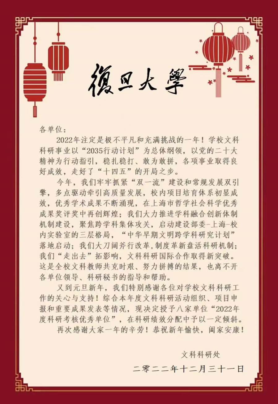 2022年12月31日,復(fù)旦大學(xué)文科科研處公布了“2022年度科研考核優(yōu)秀單位”名單,我中心入選。這是中心連續(xù)第二個(gè)年度入選復(fù)旦大學(xué)科研考核優(yōu)秀單位。