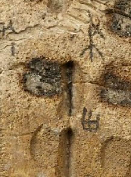 正面13辭曰:“乎《摹系》7433反面2辭曰“取日?伐”,《新研》乙6273反面D辭釋作“取合伐”。根據(jù)清晰照片,《新研》D辭釋文更為合理。該辭位于右首甲二排第1個卜兆處,與正面兆序“一”對應(yīng)。因為拓片模糊不清,故單看拓片容易將所施之鑿尖狀的前端訛混作刻寫的筆畫。照片中“取合伐”三字涂墨,“合”字跨右首甲與右前甲夾角[10]齒紋,且與右前甲夾角一排第1個鉆鑿存在打破關(guān)系,形體依稀可辨,參考圖一。“合”在卜辭中有會合、聚合義[11]。“合”可以用在不同祭名之間,如《屯南》248有辭曰“貞:又(侑)