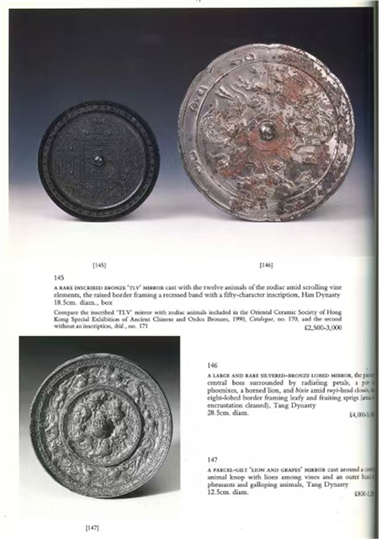 倫敦佳士得(Christie London)1992年6月8日的拍賣圖錄(圖一)中有編號(hào)145拍品,為一件西漢晚期福祿進(jìn)兮銘八乳神獸博局紋鏡(圖二)。此鏡據(jù)稱為李爾白及駱桂生伉儷所藏。圖錄中介紹云,李爾白(1930-2021)為著名金石鑒藏家李蔭軒(1911-1972)之子,而李蔭軒先生為晚清重臣李鴻章(1823-1901)侄孫,其部分高古青銅器珍藏於1979年已捐贈(zèng)予上海博物館,成為現(xiàn)藏於上博的重要珍器。