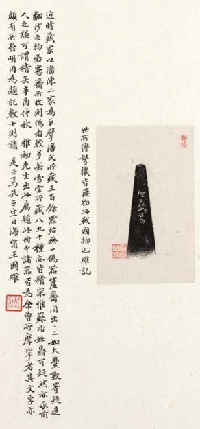 王國維題跋謹嚴還表現(xiàn)在對拓本裱裝的要求較高,常會提出這方面的要求。其1923年3月曾致徐乃昌信謂:“前日屬題秦公敦拓本,正欲濡豪,苦無下筆之處。因此拓付裝時文字必作三層分列,全形拓本之上方已不能容。若分裝兩幅,以文字爲一幅,器形爲一幅,則器之上方正可題字,然此裝法卻不甚合宜。最好付裝後再題,則器形之下儘有題字之餘地也。尊意如何?乞示。”(《王國維全集·書信》第334頁)