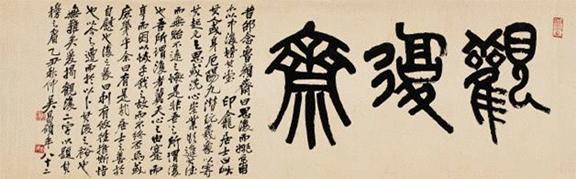 昔邵念魯顏齋曰“思復”,而姚石甫亦以“中復”榜其堂。印龕居士曰:此其人或身厄陽九,潛玩羲象,以寄其起元之思;或洗心崇業(yè),欲進其德,而無貽不遠之悔,是非吾之所謂復也。吾所謂復者,冀天心之由蹇而亨,而因以恢乎我之故,而不終否焉,或庶幾乎?余曰:有是哉,居士之善於自慰也。復之彖曰:利有攸往。推斯恉也,以今之遭而於以卜其後之裕也無難矣。爰揭“觀復”二字以題其榜之眉。乙丑秋仲,吳昌碩年八十二。⑷