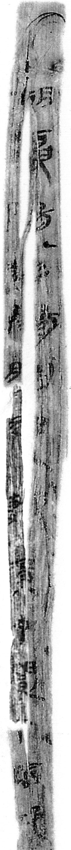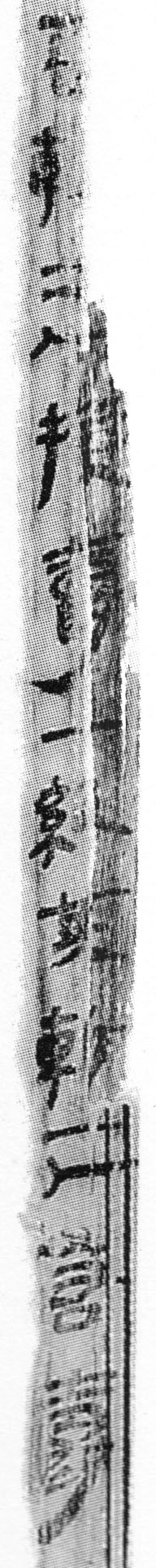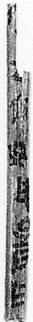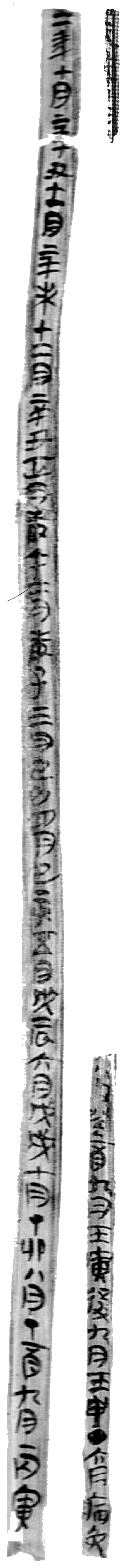一、第七列共六片殘簡(jiǎn),其中第一片如圖一左。經(jīng)端詳,此為“●元年十月”的右半邊,應(yīng)為“曆譜圖版”第一○枚簡(jiǎn)牒頂端所殘缺,與次枚“二年十月……”語(yǔ)序吻合。