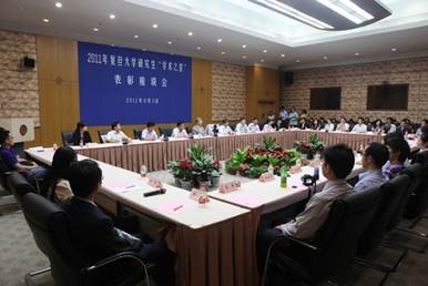 2011年度共有29名同學(xué)獲得研究生“學(xué)術(shù)之星”榮譽(yù)稱號(hào)。6月3日下午在逸夫科技樓多功能廳舉行研究生“學(xué)術(shù)之星”評(píng)選表彰座談會(huì),黨委研究生工作部部長(zhǎng)周立志主持座談會(huì),校黨委陳立民副書記宣讀入選名單,楊玉良校長(zhǎng)為“學(xué)術(shù)之星”頒獎(jiǎng)並講話。獲獎(jiǎng)同學(xué)代表做了發(fā)言,彙報(bào)治學(xué)心得與體會(huì)。研究生院、宣傳部相關(guān)負(fù)責(zé)人參加了會(huì)議。