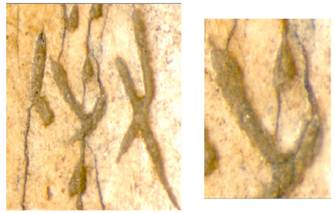 表一的結果顯示了以全版刻辭的裂紋分佈可以提供一個幾乎是涇渭分明的區(qū)分商代肩胛骨刻辭真?zhèn)蔚臏蕜t。利用同樣方法我們仔細以顯微鏡觀察《庫》1506家譜刻辭上54個刻字與骨版裂紋的關係。圖18是兒氏家譜刻辭中可見的A型裂紋,圖19是典型的B型裂紋,圖20是典型的C型裂紋。我們計算各型裂紋在54個刻字的分佈發(fā)現(xiàn)兒氏家譜刻辭中只見A,B,C三型裂紋而完全不見Y型裂紋,更有意思的是A,B,C三型裂紋在家譜刻辭的分佈比例與《庫》1619左方刻辭幾乎完全一樣(表二)。