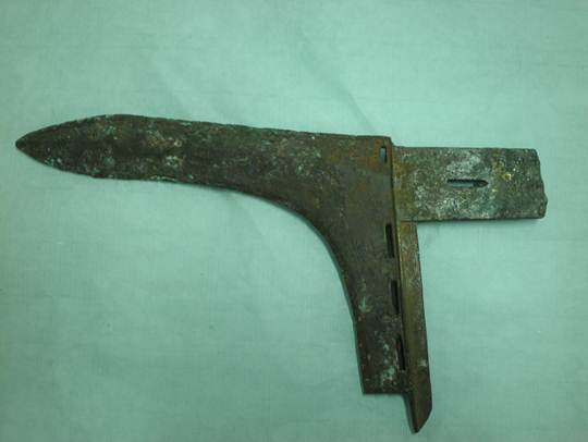 2008年,安徽省文物考古研究所先后在安徽蚌埠地區(qū)發(fā)掘了兩座奇特的春秋時(shí)期墓葬,出土了一批有銘青銅器,銘文資料已公布在發(fā)掘報(bào)告中。值得注意的是,一號(hào)墓中還出土兩件徐國(guó)兵器:M1:47戈和M1:382戟。由于其材料的獨(dú)特性,一直未正式公開發(fā)表。 M1:382戟長(zhǎng)29厘米,鑄有銘文:“余(徐)王容(?)?。考鹱宰髌湓?/SPAN>□” (胡部,銘文銹蝕嚴(yán)重,隸定以意補(bǔ)之);M1:47戈長(zhǎng)20厘米,兩面均有銘文:一為“余(徐)子白(伯)