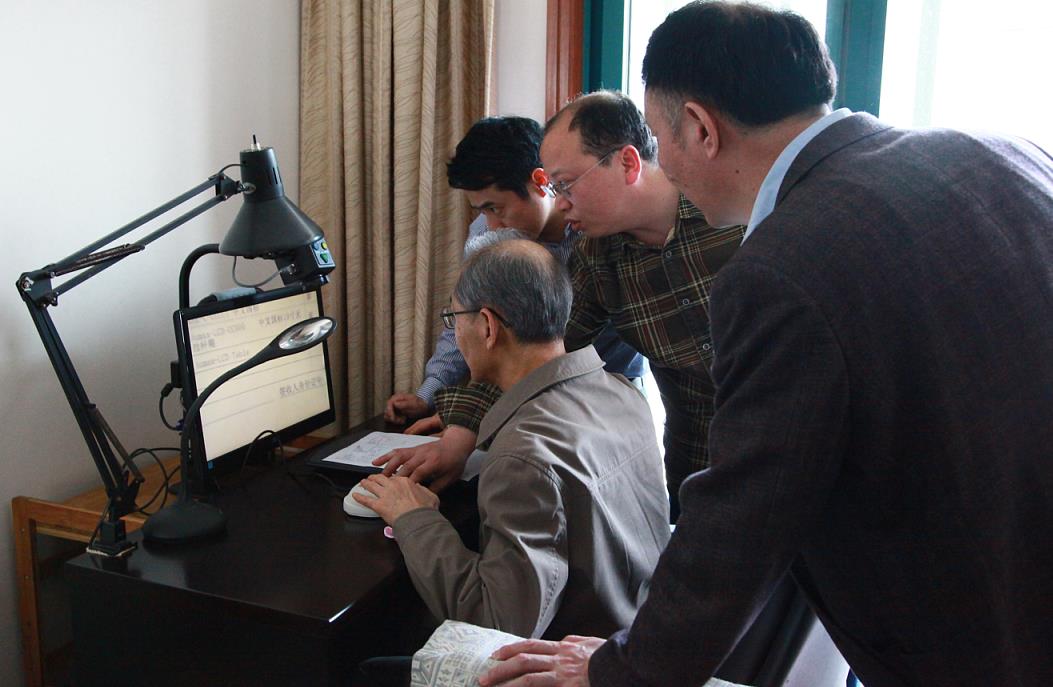孫興懷院長、戴錦暉醫(yī)師以及朱毅先生耐心講解了助視器的操作方法,并就視力保護(hù)、用眼衛(wèi)生等提出建議。裘錫圭教授對眼耳鼻喉科醫(yī)院及孫興懷院長等人的盛情和關(guān)心表示感謝。